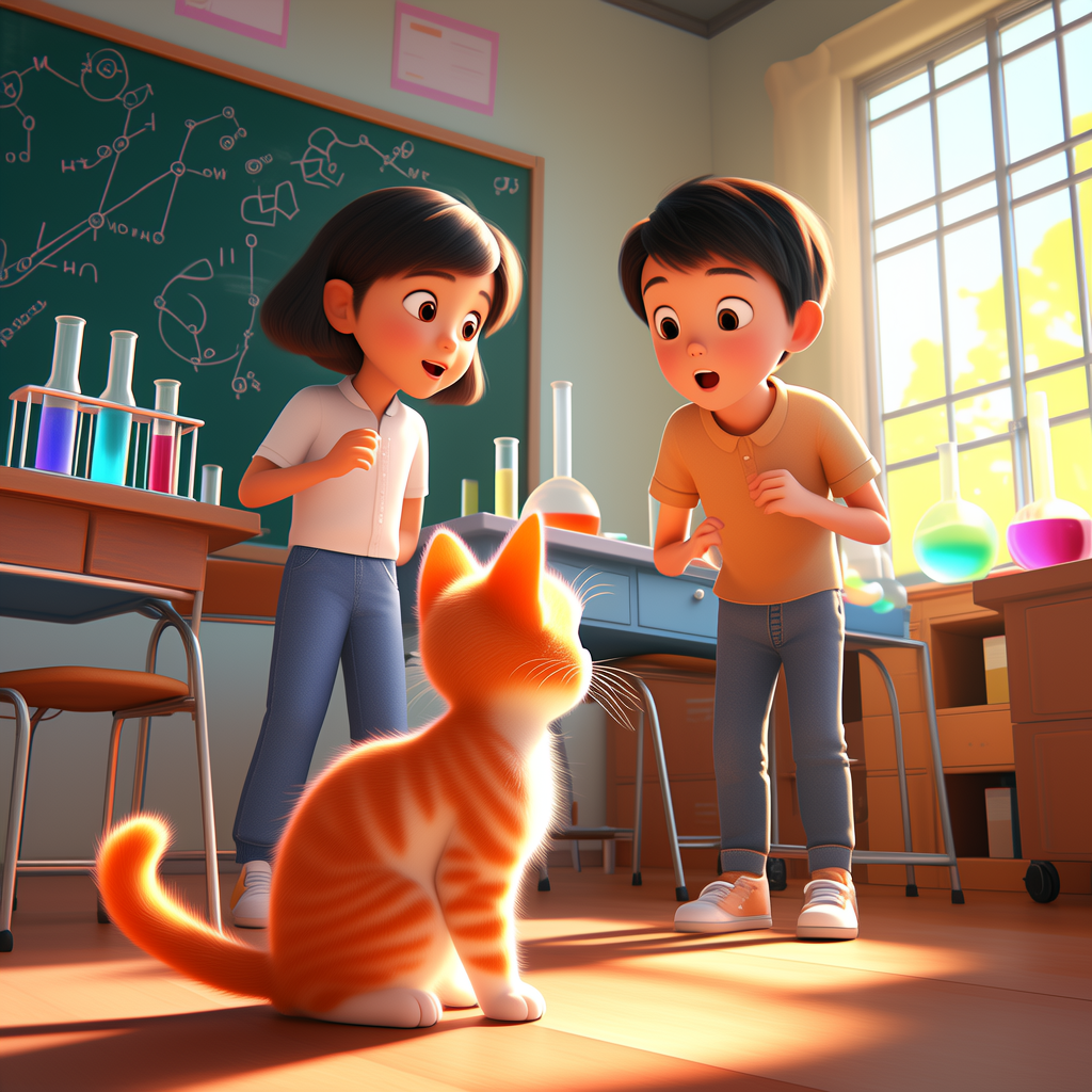 正当樱樱准备给象彩彩介绍望远镜的使用方法时,教室门被推开了。"樱樱?你怎么来学校了?"是樱樱的同桌小明。"我在带我的朋友参观!"樱樱开心地说,"这是象彩彩。"小明惊讶地看着象彩彩:"哇!好漂亮的猫咪!它的毛发怎么会是彩虹色的?"象彩彩友好地"喵"了一声,在小明面前优雅地转了个圈,逗得两个小朋友哈哈大笑。
