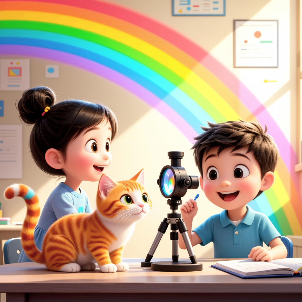 "对了,"小明突然想起什么,"我正要做一个有趣的实验,你们要一起来看看吗?"在小明的带领下,他们一起做了一个简单的光的折射实验。当阳光透过三棱镜时,美丽的彩虹出现在墙上。象彩彩盯着墙上的彩虹,眼神中闪过一丝神秘的光芒。樱樱注意到,它的毛发似乎和墙上的彩虹产生了某种奇妙的共鸣。