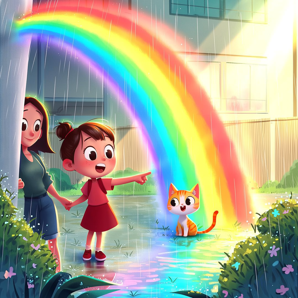 就在他们走近小花园的时候,一道异常绚丽的彩虹突然出现在眼前。这不是普通的彩虹——它的颜色比普通彩虹要艳丽得多,而且彩虹的形状也很奇特,像是一个半圆形的门。"哇!妈妈你看!"樱樱惊叹道,"这道彩虹好特别啊!"妈妈也惊讶地看着这道不同寻常的彩虹:"确实很特别呢。不过樱樱要记住,看到特别的东西时要保持安全距离哦。"