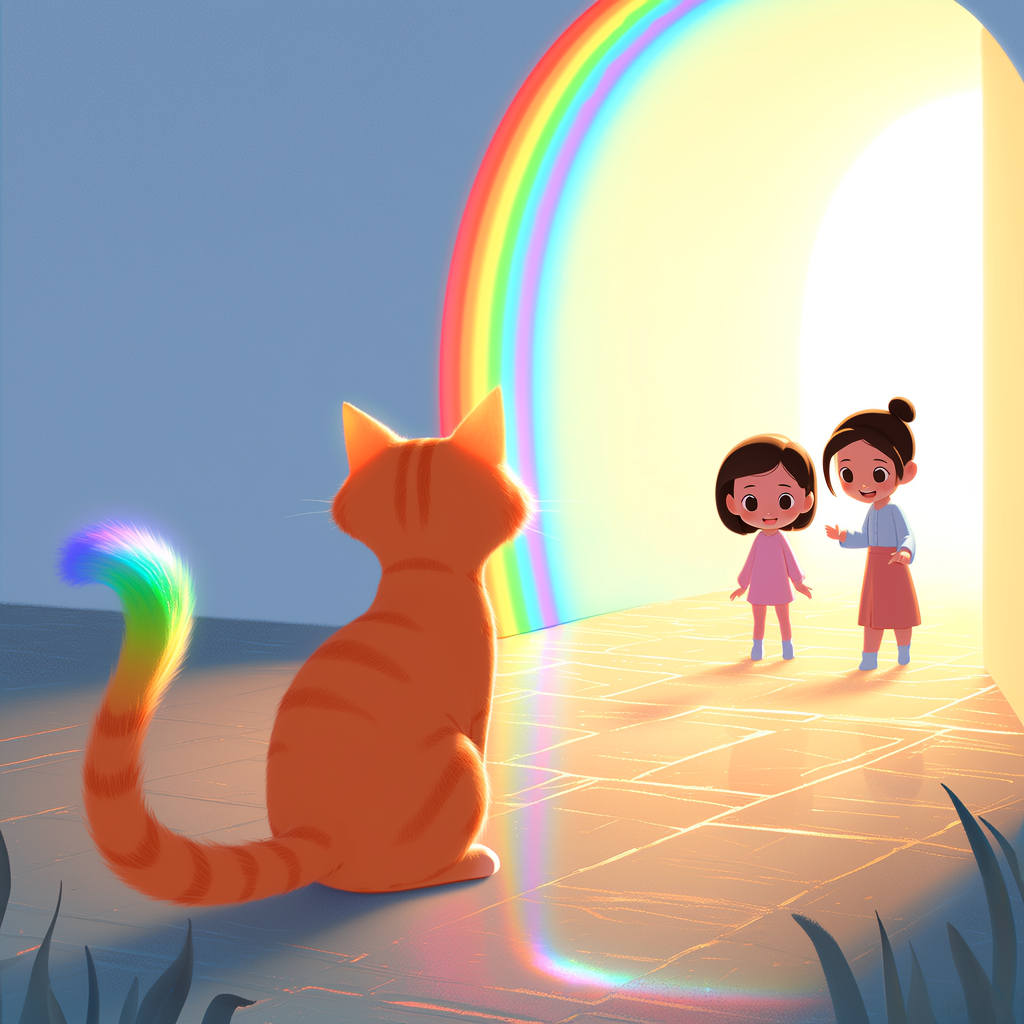 就在这时,象彩彩从树丛中窜了出来。让樱樱和妈妈都感到惊奇的是,象彩彩的彩虹色毛发似乎在这道特殊彩虹的照耀下变得更加闪亮了。"象彩彩!"樱樱开心地喊道,"你的毛发好像在发光呢!"象彩彩轻巧地跳到樱樱身边,用头蹭了蹭他的腿,然后抬头望向那道彩虹。它的眼神中似乎透露着某种神秘的光芒,就好像它知道些什么似的。