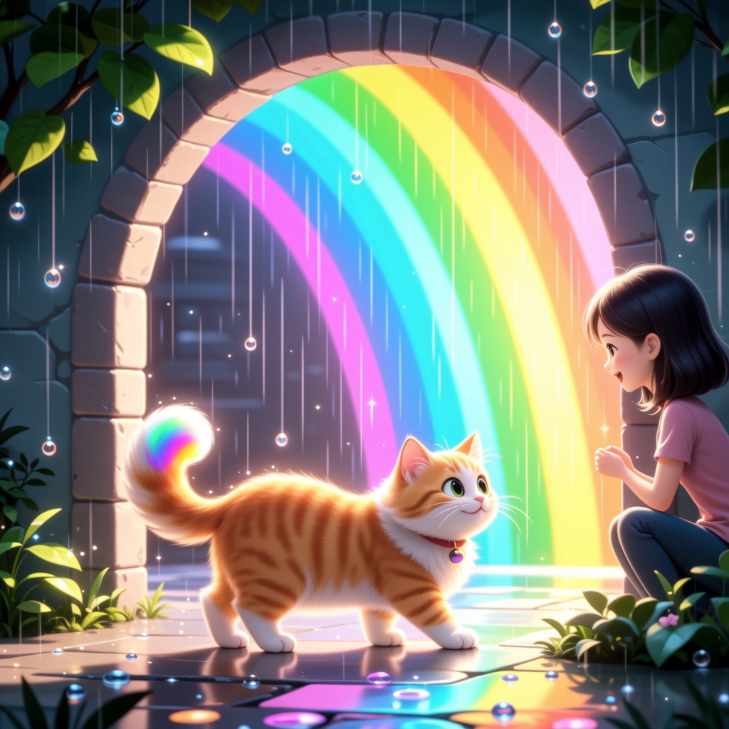 "妈妈,你看象彩彩的样子,它好像认识这道彩虹!"樱樱观察着说。妈妈温柔地笑着说:"也许这只是巧合呢。不过这确实是一个很神奇的时刻,我们应该好好记住它。"象彩彩忽然站起身,在彩虹前走来走去,它的尾巴高高翘起,彩虹色的毛发在阳光下闪闪发亮。每当它走近彩虹时,彩虹的光芒就会微微波动,就像水面泛起涟漪一般。