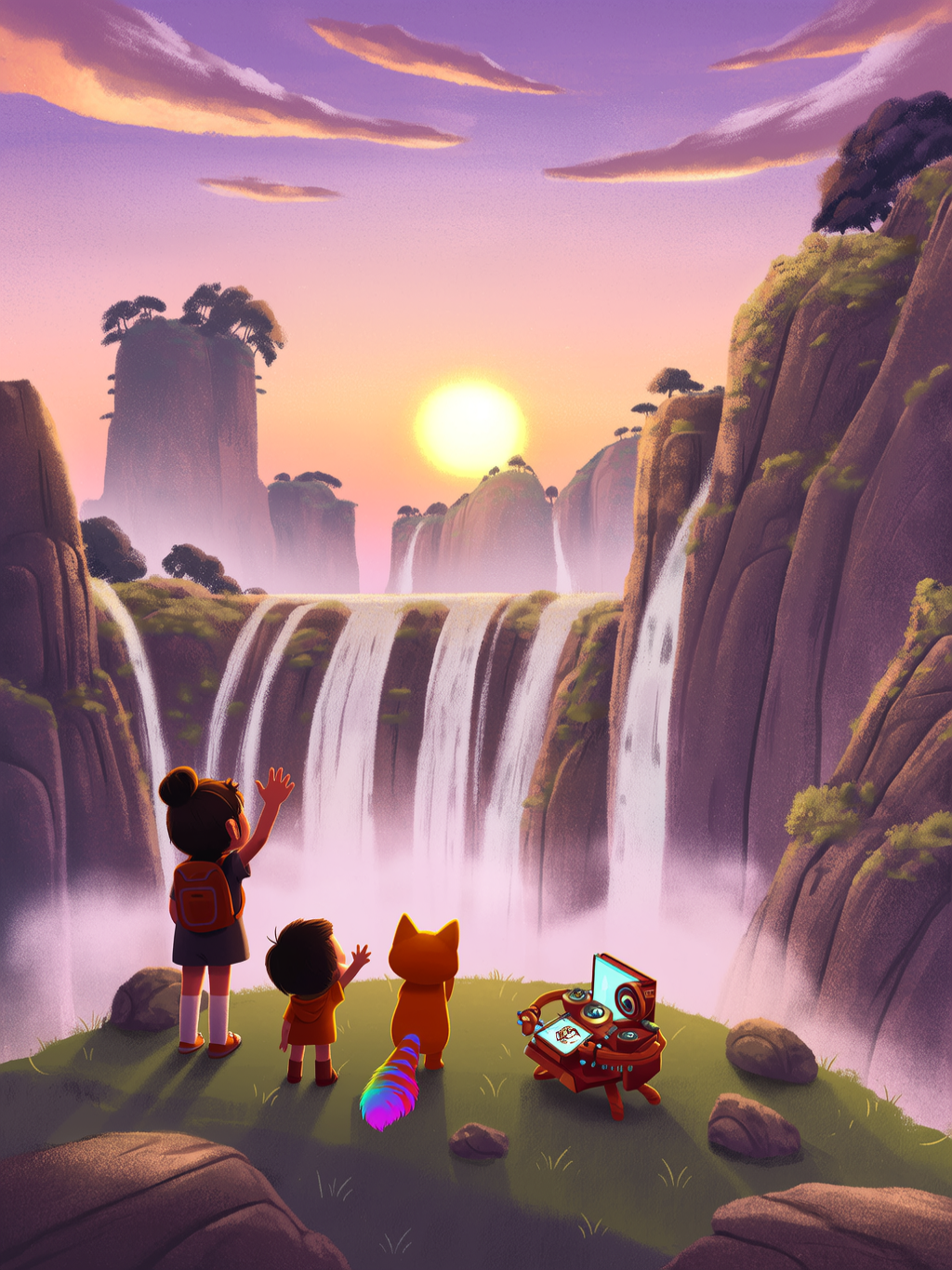 <Child mode="inline_text_zh" />不舍地说:再见了,美丽的庐山瀑布!李白的诗会永远留在我们心中!