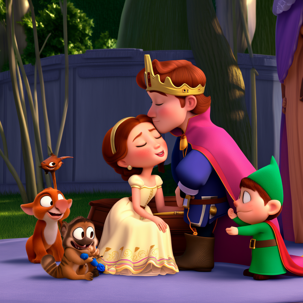 小矮人们以为白雪公主真的死了,他们把她放在水晶棺材里。后来一位英俊的王子路过,被白雪公主的美丽打动,他深情地吻了她一下,白雪公主就醒来了。